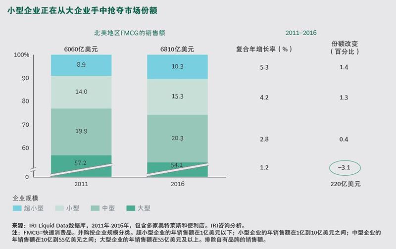 過去50年,跨國消費品企業(yè)強(qiáng)化品牌、擴(kuò)展產(chǎn)品組合、穩(wěn)步提高市場占有率和收入,創(chuàng)造了強(qiáng)大的股東價值。那曾是大媒體、大零售商、大品牌的時代。大約五年前,規(guī)模較小的企業(yè)和品牌首次開始瓜分大品牌的蛋糕。在2011年到2016年間,北美地區(qū)大約220億美元的行業(yè)銷售從大企業(yè)轉(zhuǎn)移到小企業(yè)。歐洲也經(jīng)歷了同樣的改變。